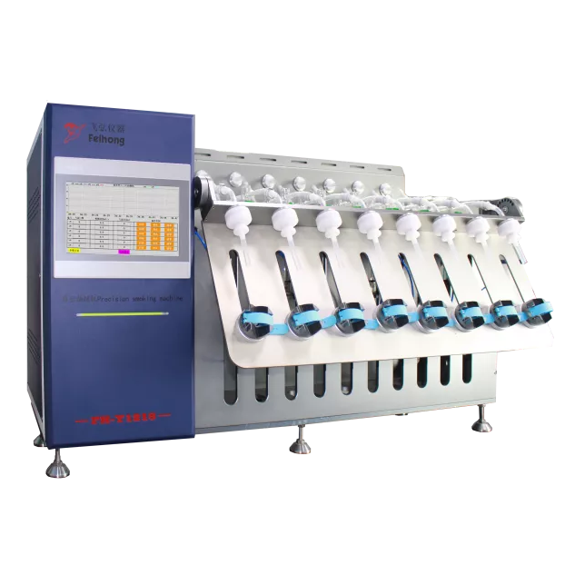 The 8-station precision smoke machine is primarily used for testing electronic cigarettes and e-liquids. By setting the corresponding smoking duration, smoking volume, and smoking times, the electronic cigarette to be tested is then fixed on the holder. The cigarette-lighting thumb cylinder on the holder activates the electronic cigarette's lighting button. At this point, the piston in the device simulates manual smoking action and inhales air into the electronic cigarette at a set flow rate. After smoking, smoke analysis is conducted on the gas collection bottle or filter to determine whether the electronic cigarette is qualified. This machine meets the standard smoking conditions for electronic cigarettes as specified in the electronic cigarette testing standard GB41700-2022.